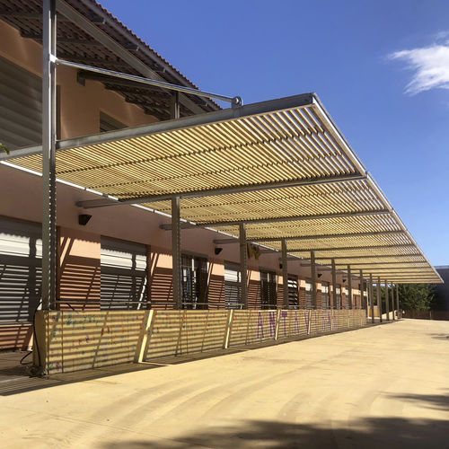 Estructuras que se podrían haber hecho con jardineras y poner glicinias, buganvillas o madreselvas para darle un toque mucho más decorativo y fresco
