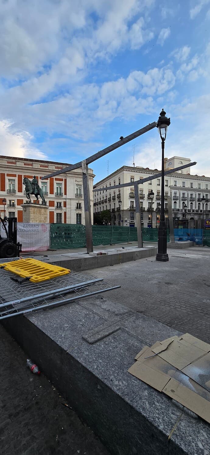 Ojalá los postes pongan el foco en lo que yo quitaría sin duda: la multitud de farolas. La plaza completa podría iluminarse por completo y de forma uniforme desde las fachadas y azoteas. Y con una plaza limpia de palos negros, los palos cromados de los toldos durante unos meses, podrían digerirse mejor.