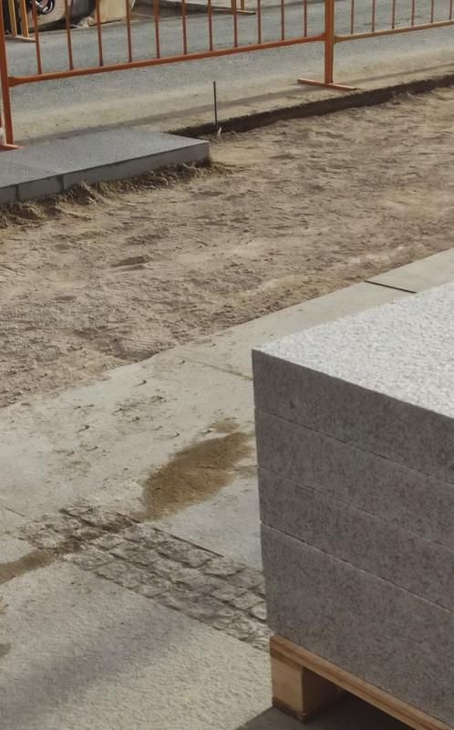 Me pregunto si tendría sentido un acercamiento más circular respecto a la obra pública y sus materiales. Reutilizar los adoquines que salen bajo el asfalto y volver a colocarlos. Y para el acerado definir unas losas gruesas que ya vengan con los cantos “estilo rústico”. Colocarlas con juntas gruesas que permitan su asiento (Las que vienen cortadas perfectas de fábrica se mueven y al final el canto se fisura por la fuerza que ejercen unas contra otras) y que cuando se quiera hacer algún mantenimiento que se puedan retirar también (picando las juntas) y volver a colocar.