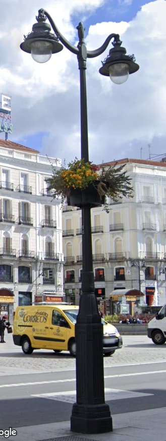 Pues a mi nunca me convencieron. Arruinaban la elegancia de las farolas, y cualquier cosa que pusieras necesitaba un mantenimiento primoroso. Demasiado trabajo para tan poco resultado. Fíjate que en la foto que traes, las farolas del arco no tienen plantas. Ahí, pocas cosas aguantan.
