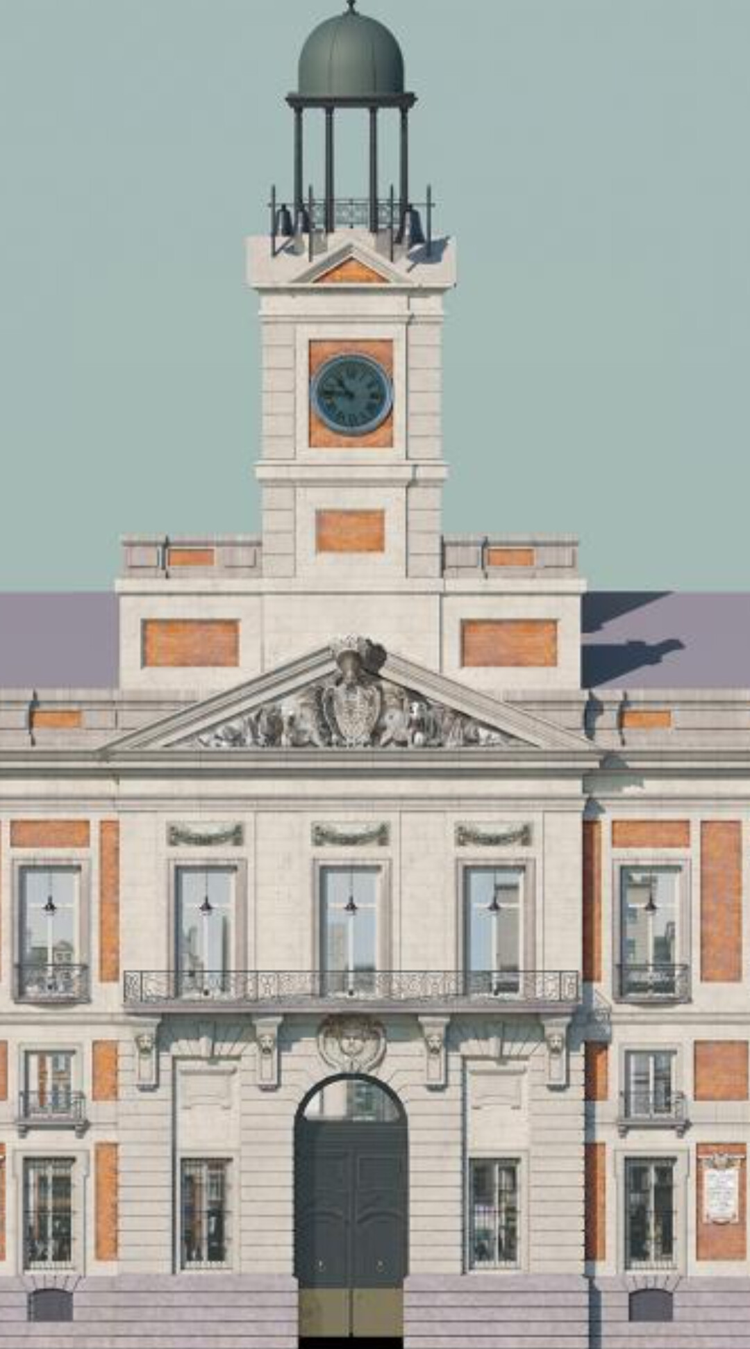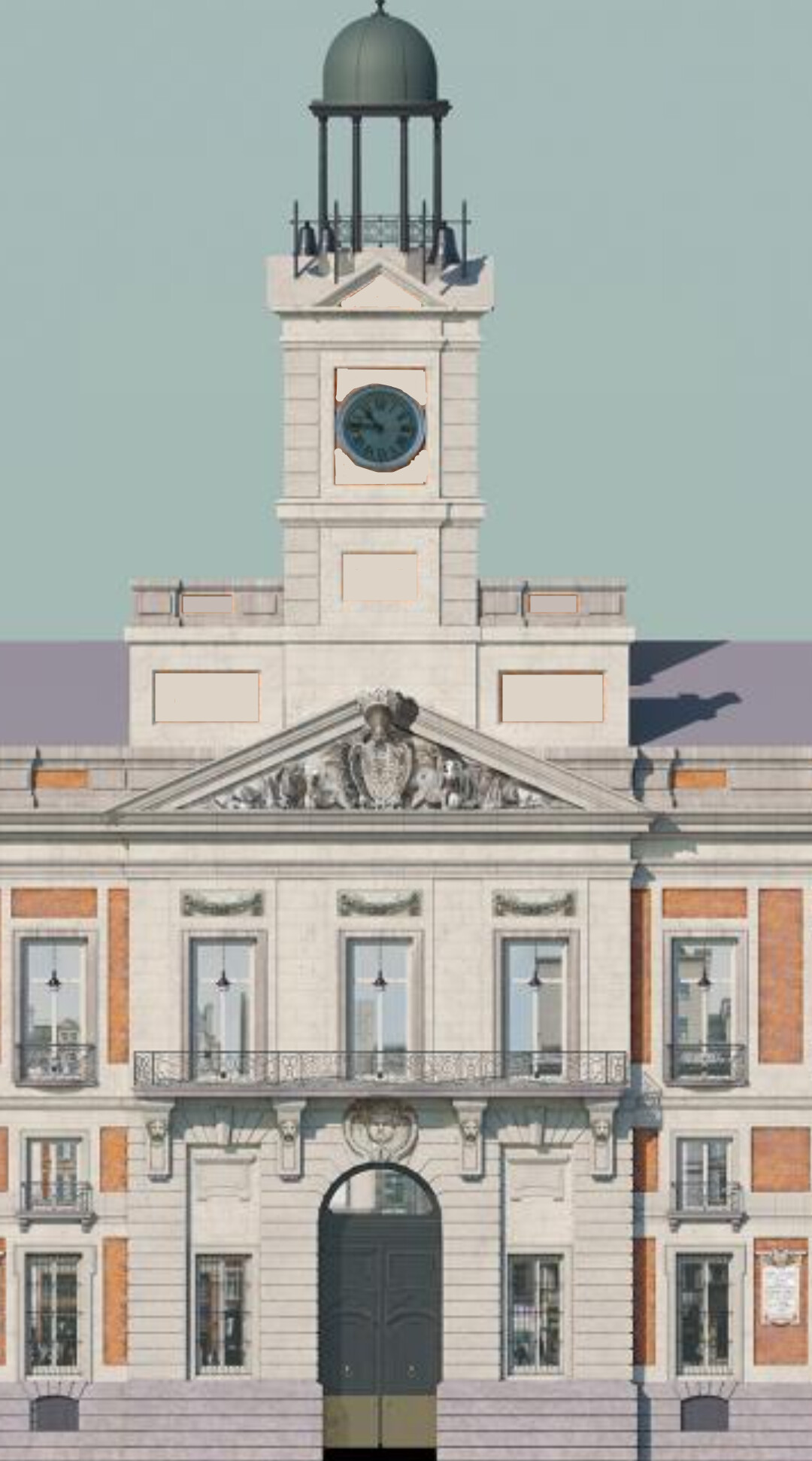 Yo creo que simplemente con cubrir los paneles de ladrillo de la torre ésta gana presencia y coherencia como prolongación vertical del acceso noble: