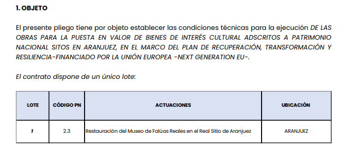 Licitación para la restauración del Museo de Falúas Reales, Importe 3.171.632,85 €, plazo de ejecución 10 meses.