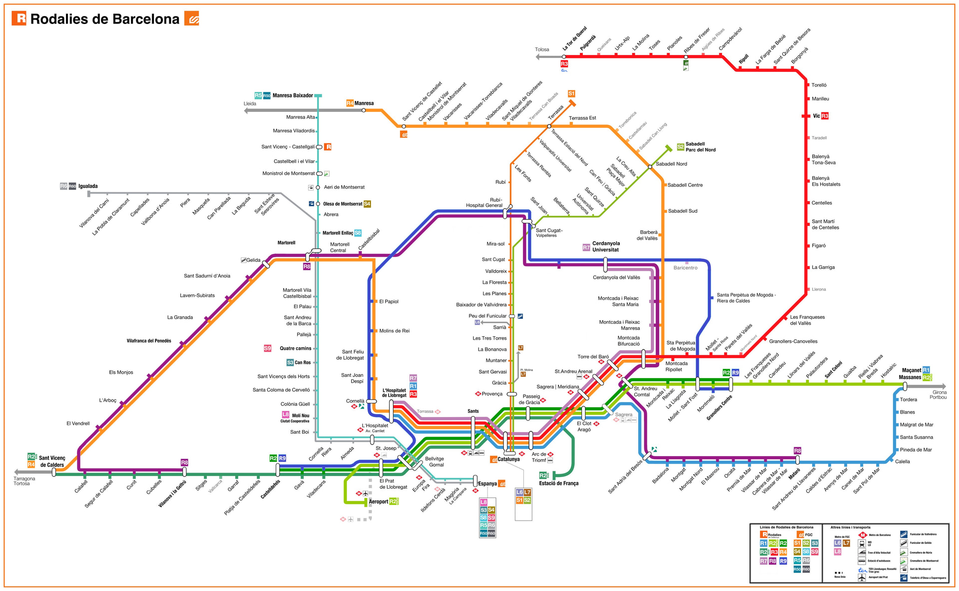 R9-Esta tendría el recorrido de la actual R8 desviándose por el Baix Llobregat. Granollers-Rubí-El Papiol-Hospitalet de Llobregat-Castelldefels. Esta desviación crearía una conexión directa entre el Garraf, el Baix Llobregat y el Vallès además de incrementar la frecuencia del tren entre zonas bastante necesitadas. Toda la infraestructura ya está hecha. Solo se han de poner trenes.