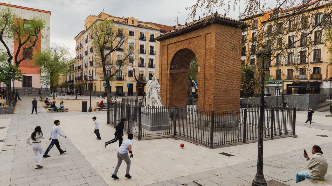 Niños jugando al futbol, gente sentada en los bancos sin cunsumir nada, seguramente habría clientes sentados en las terrazas tomando algo, otros cruzando la plaza, saliendo de las tiendas o entrando en los bares… ¿en qué plaza del centro de Madrid sucede algo así?