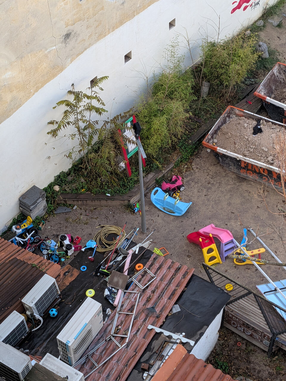 Sí. Había unos problemas serios de filtraciones de agua a la finca que se ve al fondo de la foto, en parte porque la calle hace pendiente hasta ahí. Sumado a que los muros perimetrales estaban en un estado lamentable. Se está arreglando el problema de las filtraciones y se volverán a hacer unos muros. Creo que hablar también unas instalaciones auxiliares para el equipo de fútbol que usa este solar habitualmente (Dragones de Lavapiés).