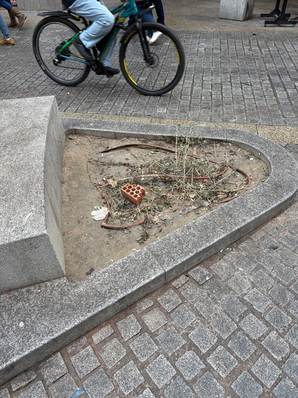 No es ninguna broma, ni una performance artística por el día de los Inocentes. Han plantado cuatro matojos, mal puestos (creo que es la misma especie que plantaron en la reforma de Alcalá) y así los han dejado. En una semana estarán muertos o directamente no estarán. Y se han quedado tan tranquilos. Lamentable.