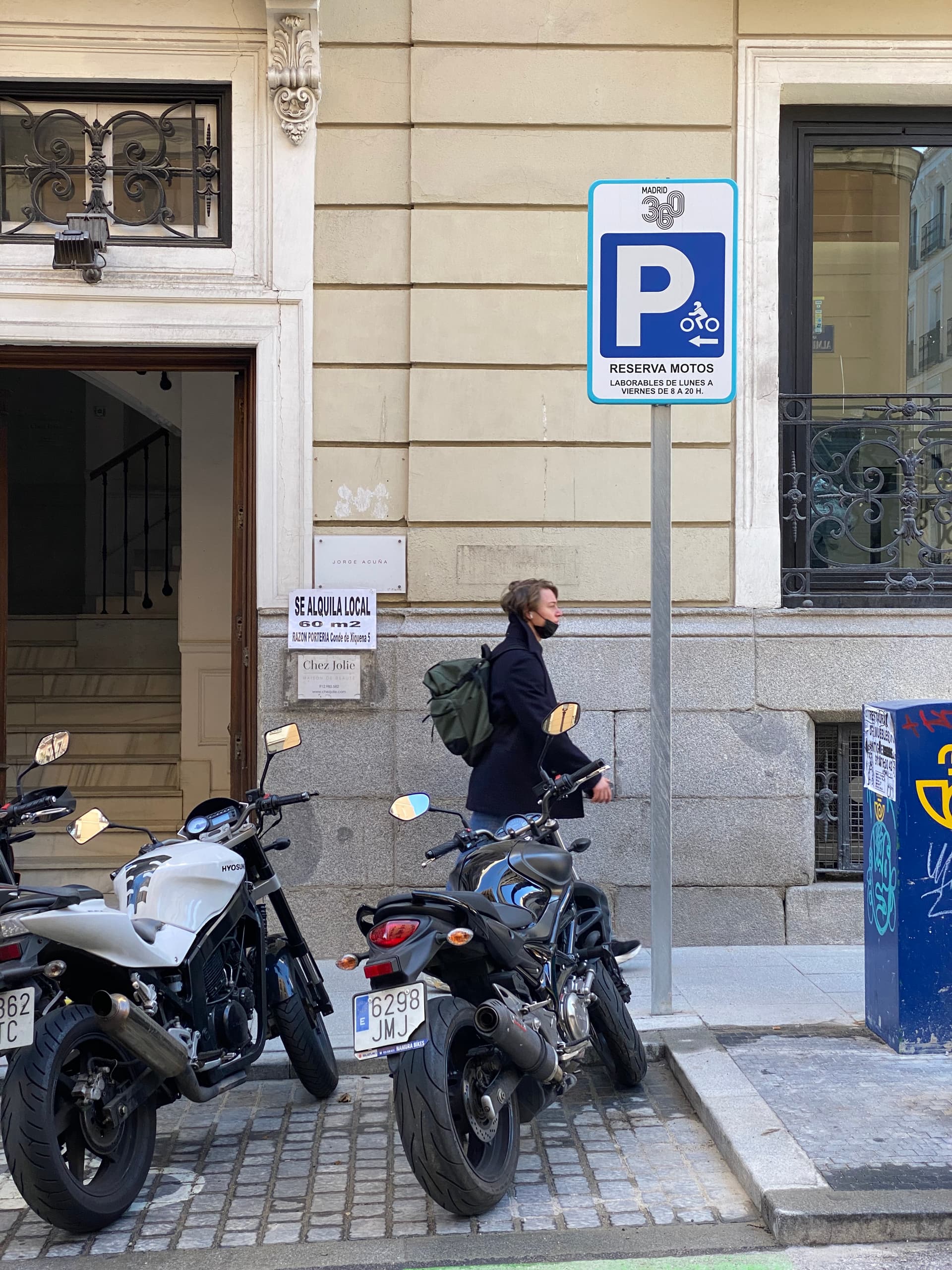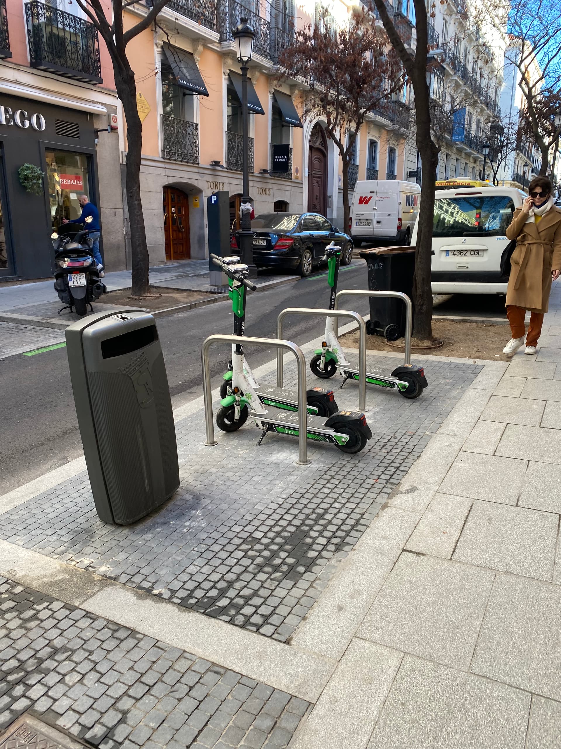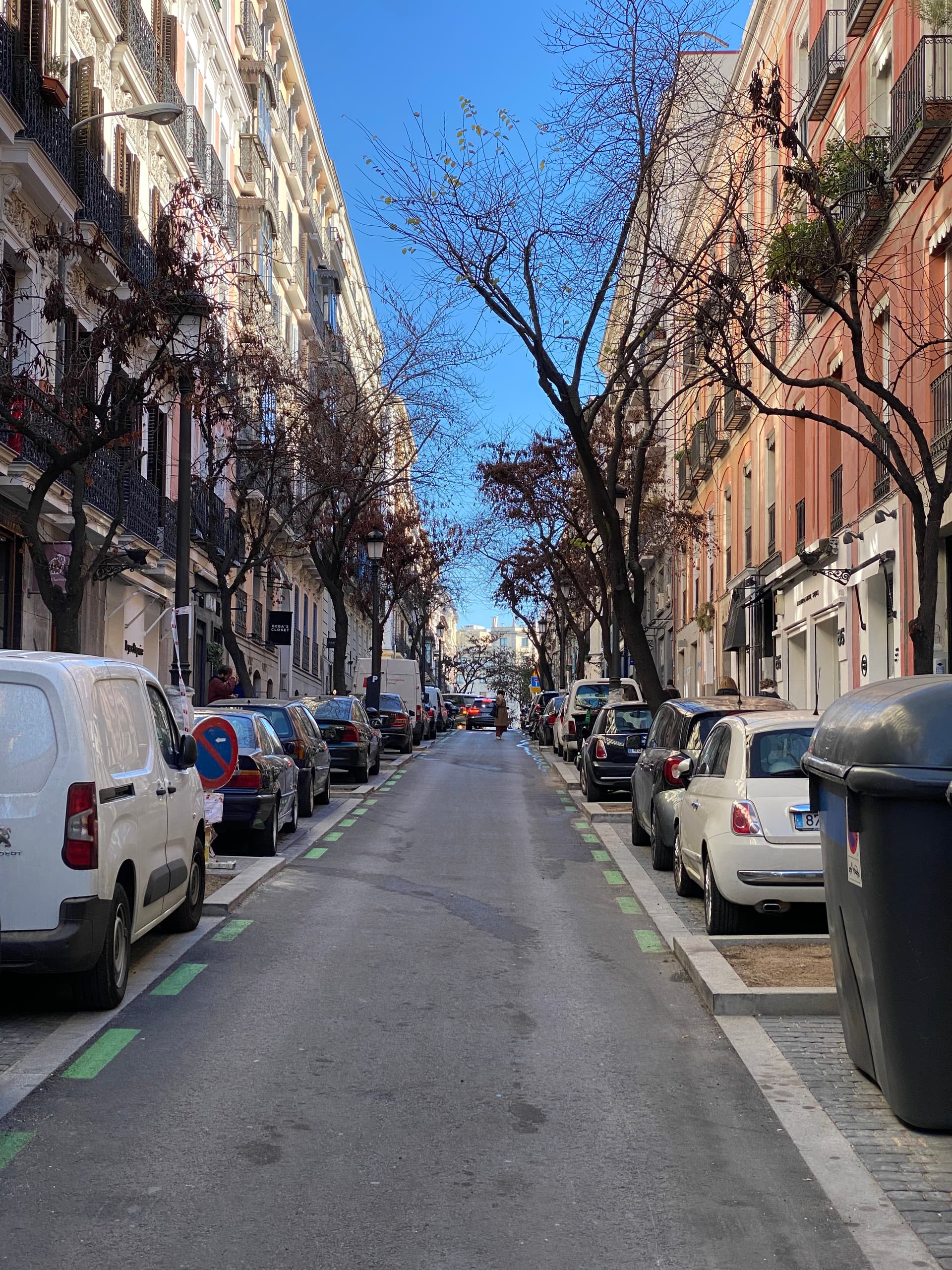 Remodelación de la calle Almirante. Bolardos más altos en el cruce con Barquillo y doble fila de aparcamiento. También parkings para bicis, motos y patinetes:
