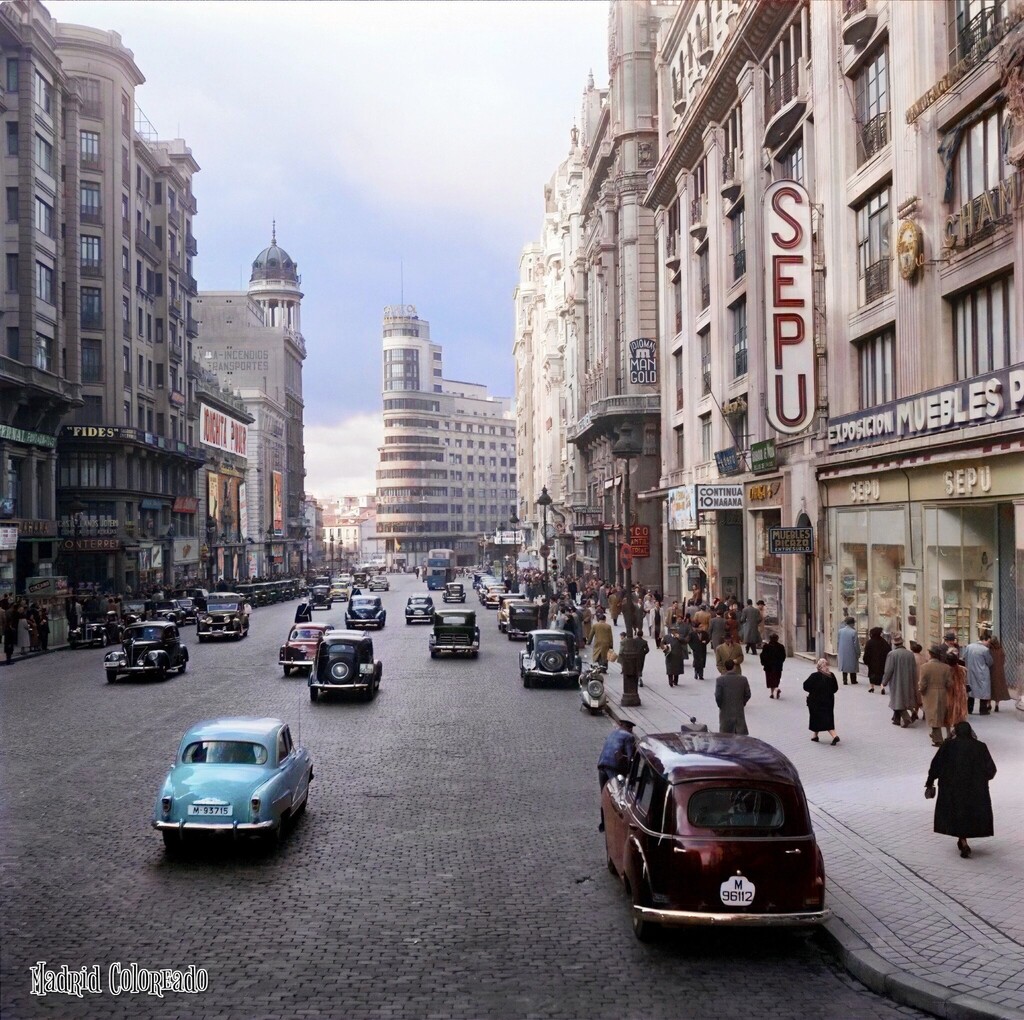 Es curioso ver esa foto de Gran Vía con unas aceras más estrechas pero donde sin embargo los peatones circulaban con más amplitud y distancia de la que tienen hoy.