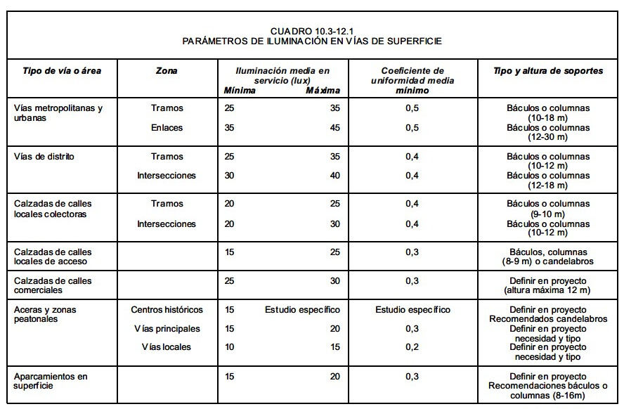 En vías de 6 a 10 metros faroles Villa a ambos lados o bien isabelinos de una o dos luminarias.