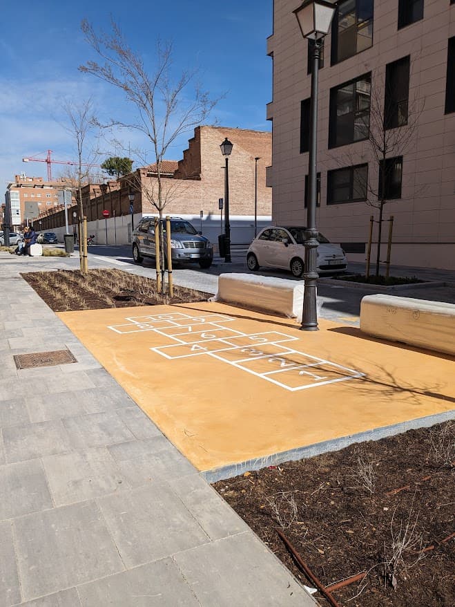 En la calle Juana Doña, con más alcorques gigantes, mucha reducción de velocidad -incluídos giros en la recta-, bancos y juegos para los chavales. Todo bien, maravilla.