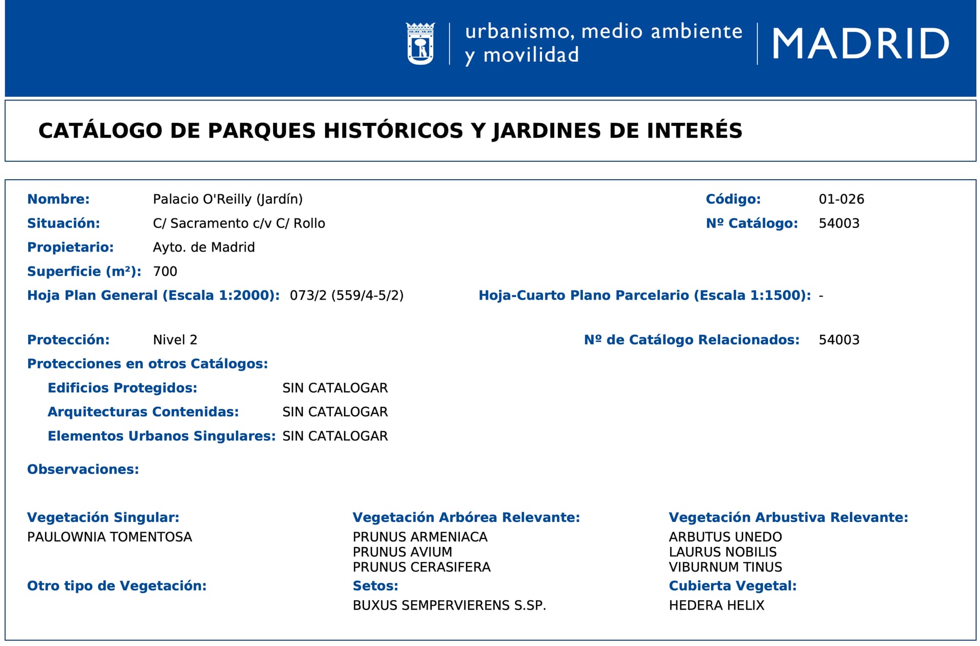 Os confirmo que se trata de un jardín municipal protegido nivel 2 (NNUU 4.6.2). En la extensión completa de lo señalado en el plano del PGOUM (1.2), lo que afectaría a la totalidad del arbolado indicado en la ficha. He visto por aquí que han identificado los árboles talados como Paulownia (me fío, yo de esto ni idea). En la ficha del catálogo los recoge específicamente como vegetación singular protegida dentro de este jardín, y desconozco cómo se gestiona su sustitución. Pero bueno, para eso estamos, para enterarnos y explicarlo.