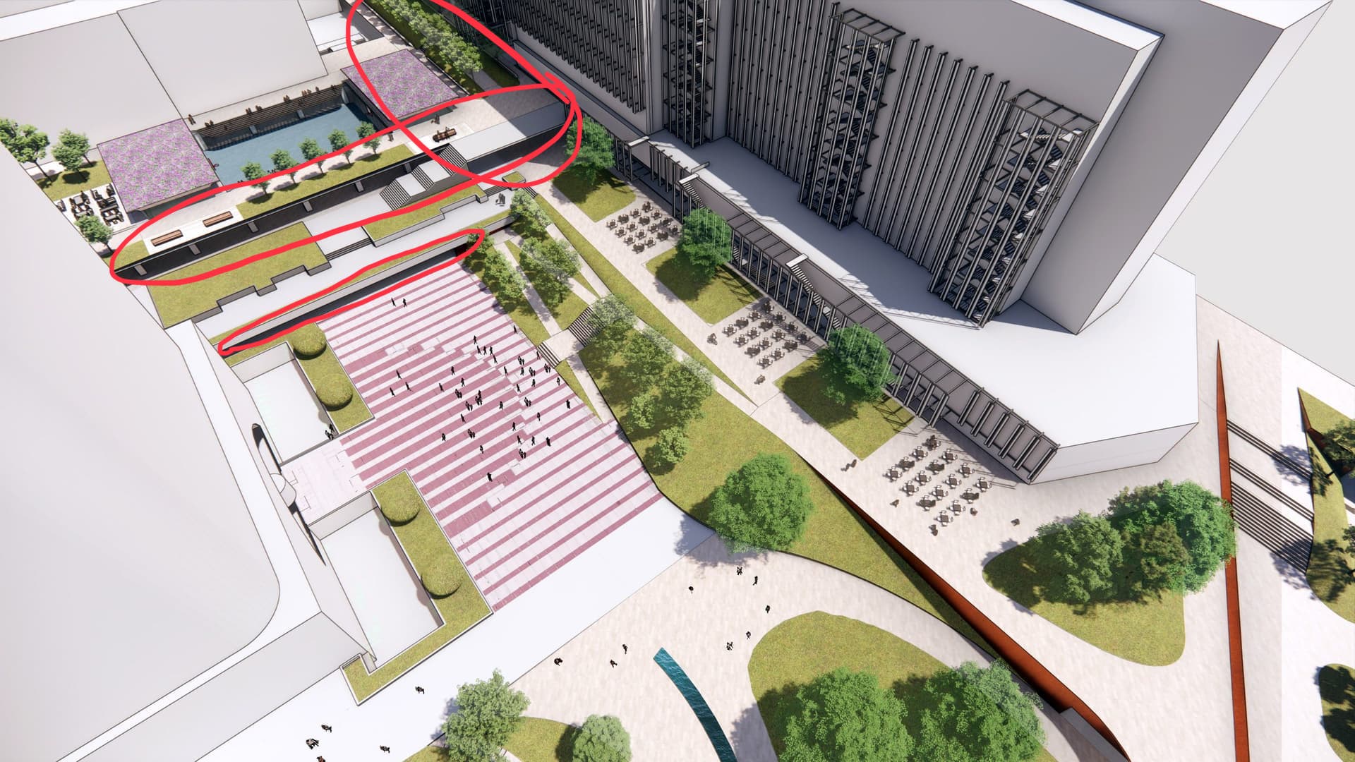 Se transforma en varias terrazas para el centro comercial y a lo que era la rotonda del subterráneo van a llevar las canchas de baloncesto (más pádel) que había en el centro de la plaza de Azca: