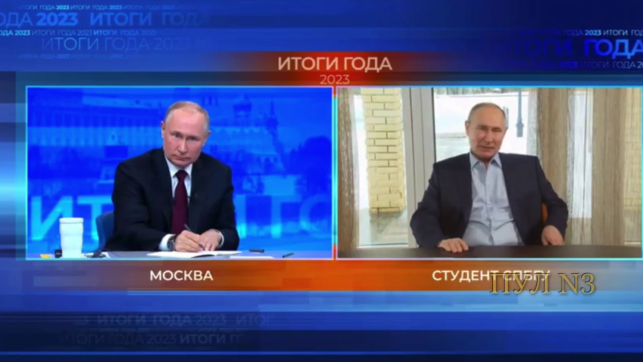 Putin (real): Veo que puedes ser como yo y hablar con mi voz, pero lo he pensado y he decidido que sólo una persona sea como yo y hable con mi voz. Y esa persona sería yo. Eso es lo que solía bromear una de nuestras figuras. Por cierto, este es mi primer doble.
