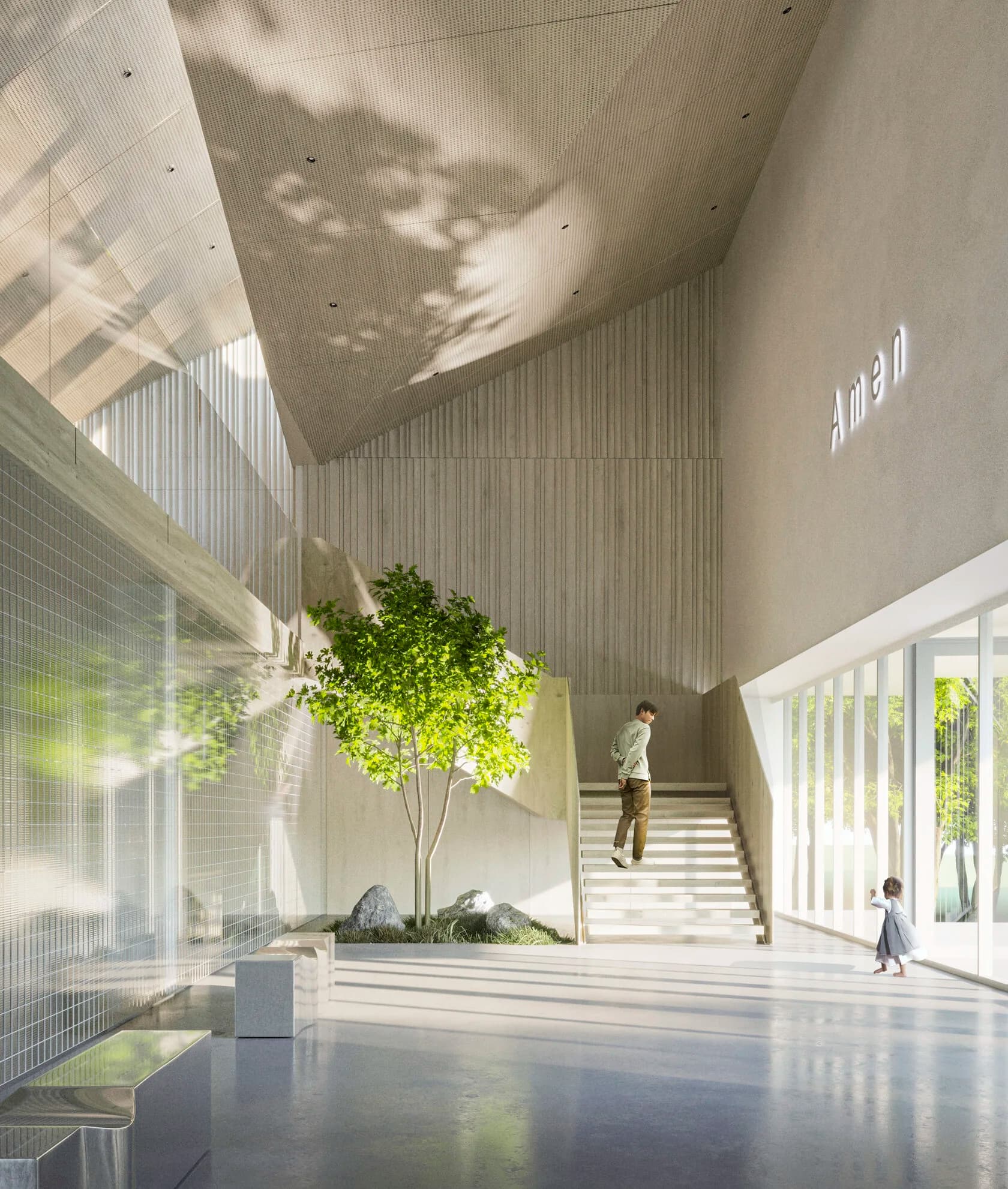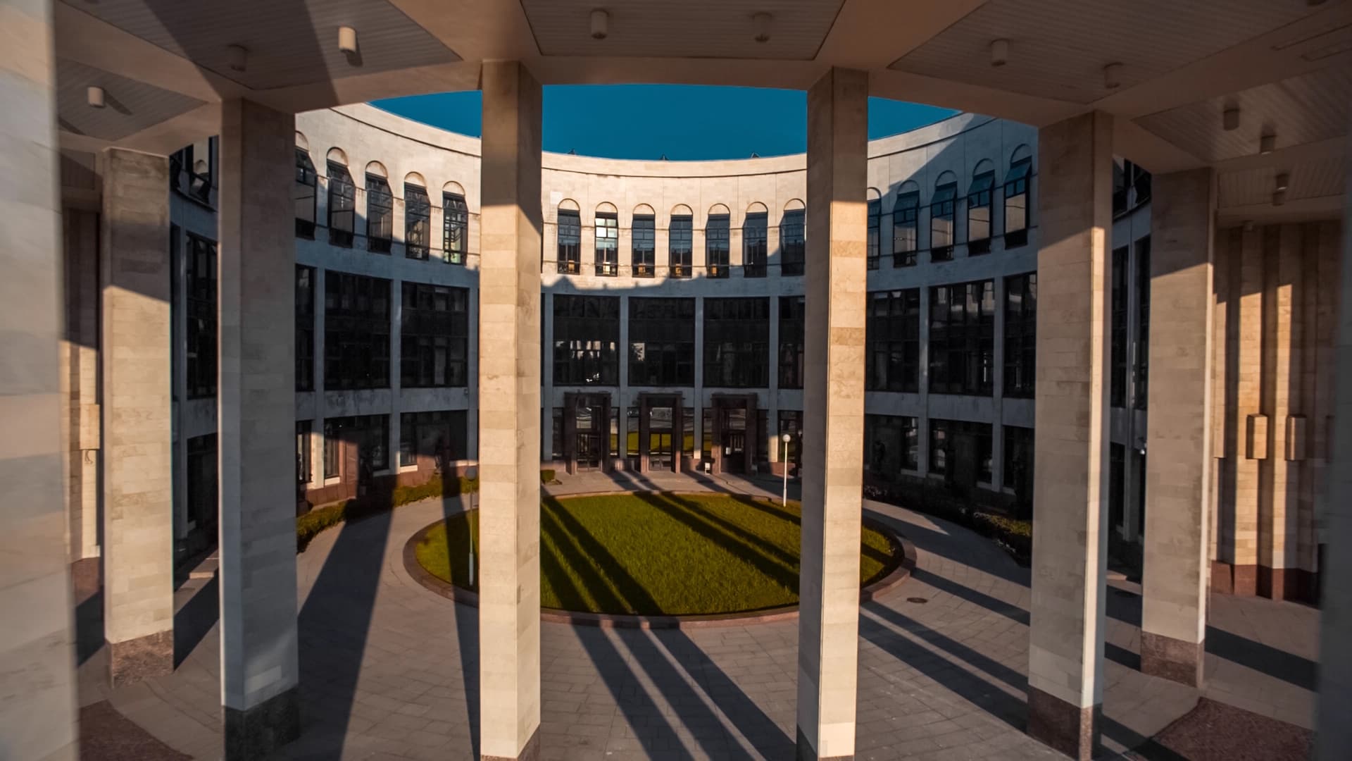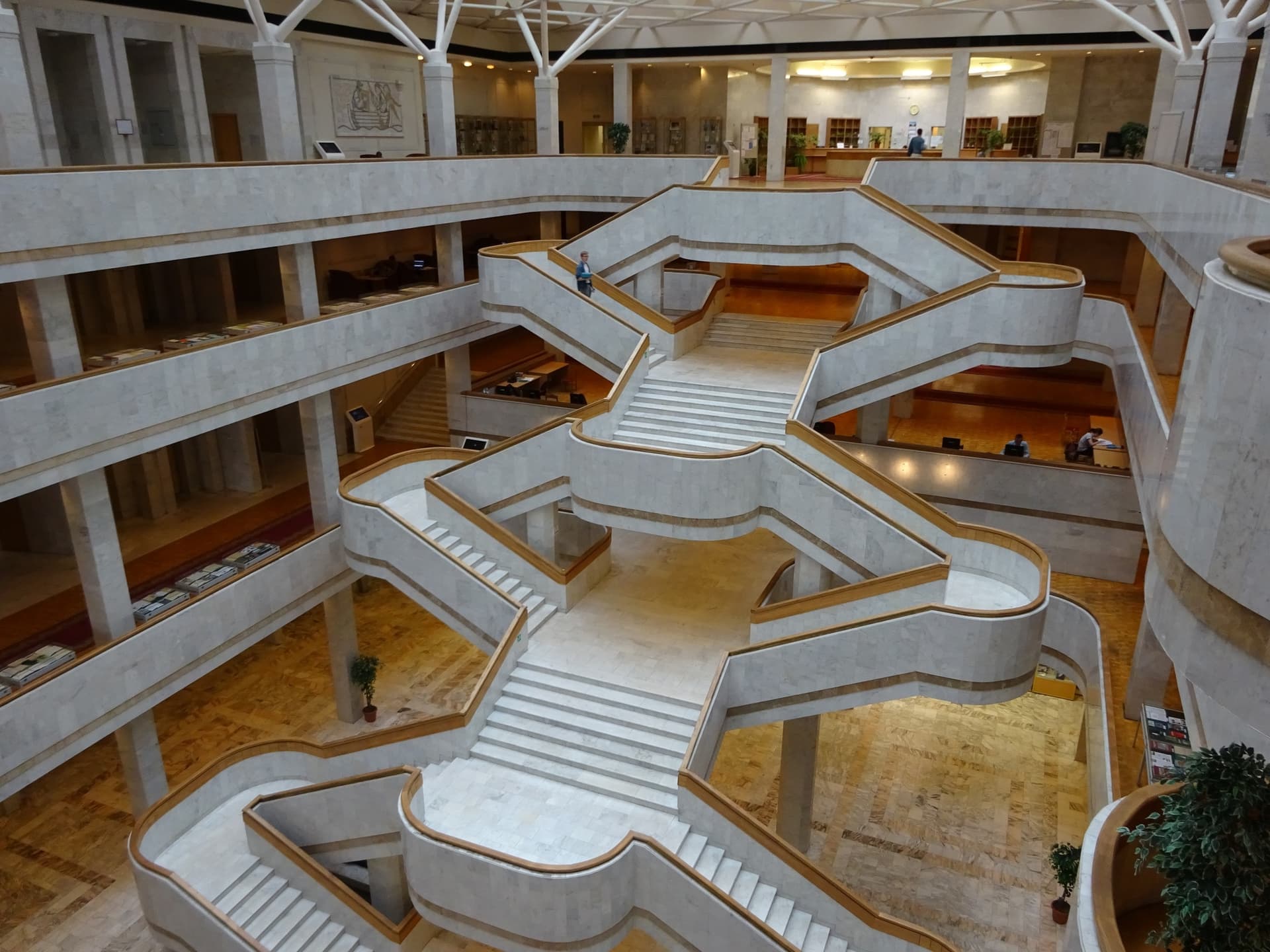 Los promotores definieron así su visión del futuro edificio: “Al diseñarlo, partimos del hecho de que el edificio se convertirá en uno de los mayores centros de ciencia y cultura. La situación urbanística también es importante: el edificio se percibirá desde las autopistas de la ciudad, con un tráfico intenso y rodeado de edificios atípicos. Por eso las fachadas están diseñadas con un carácter desfilado y monumental, especialmente la principal, que da a la avenida. Una especie de pasarela entre el entorno urbano y el entorno específico de la biblioteca será un gran patio circular bordeado por una columnata, que confiere a la fachada principal una marcada plasticidad. Las fachadas norte y sur apoyan este tema de la composición volumétrica y espacial: aquí el largo edificio está dividido por volúmenes redondeados de salas agrupadas en torno a patios interiores luminosos. Esta técnica, además de dar unidad a la arquitectura del conjunto, permite proporcionar la iluminación necesaria a los interiores y la insonorización de los locales”. Al equipo del autor que trabajó en la creación del complejo de la biblioteca le unía el deseo de dar a este edificio un aspecto arquitectónico y artístico digno de su época, de encajar delicadamente el edificio en la urbanización existente y, al mismo tiempo, de ofrecer el máximo nivel de comodidad a los lectores y al personal.
