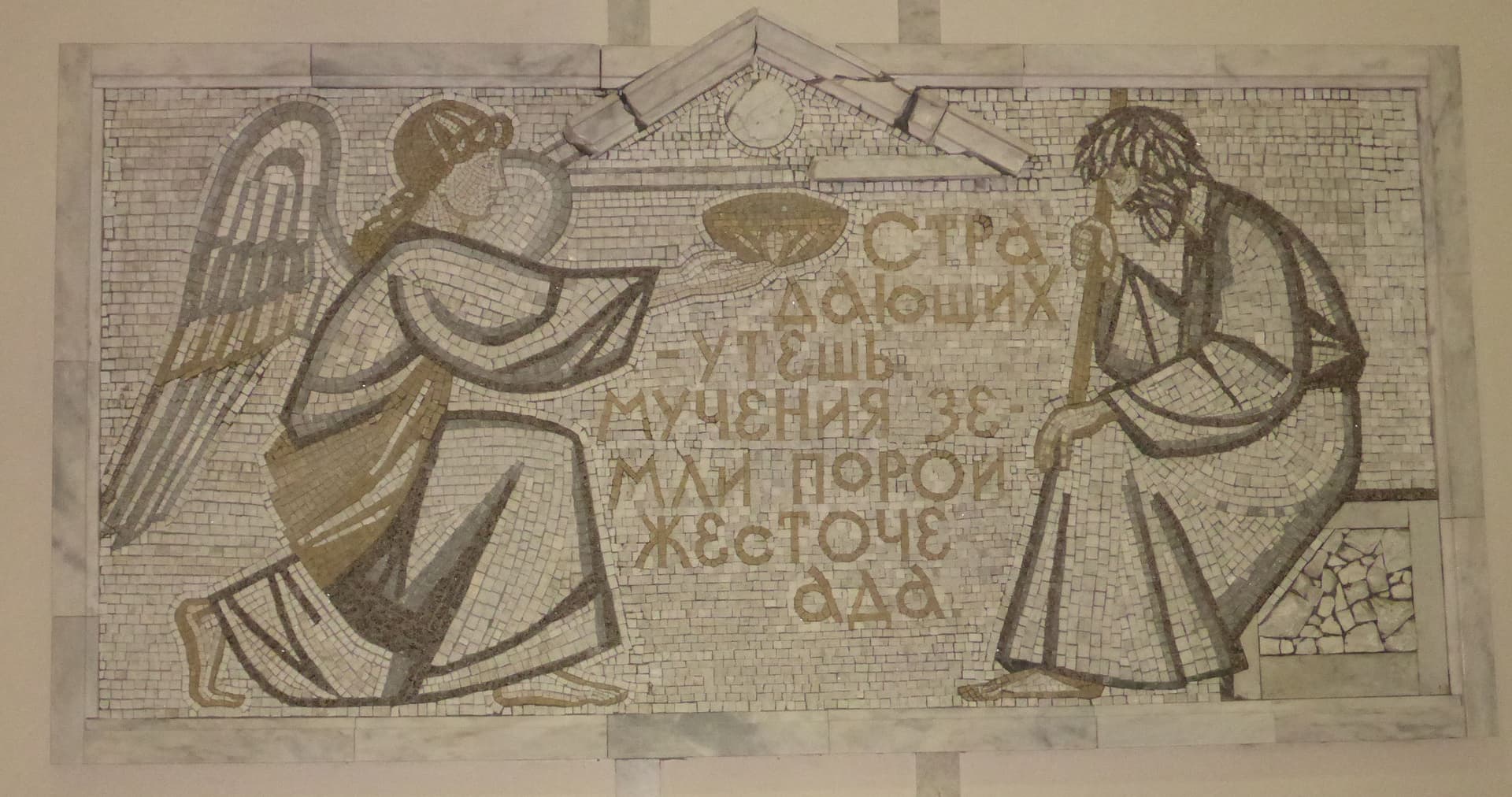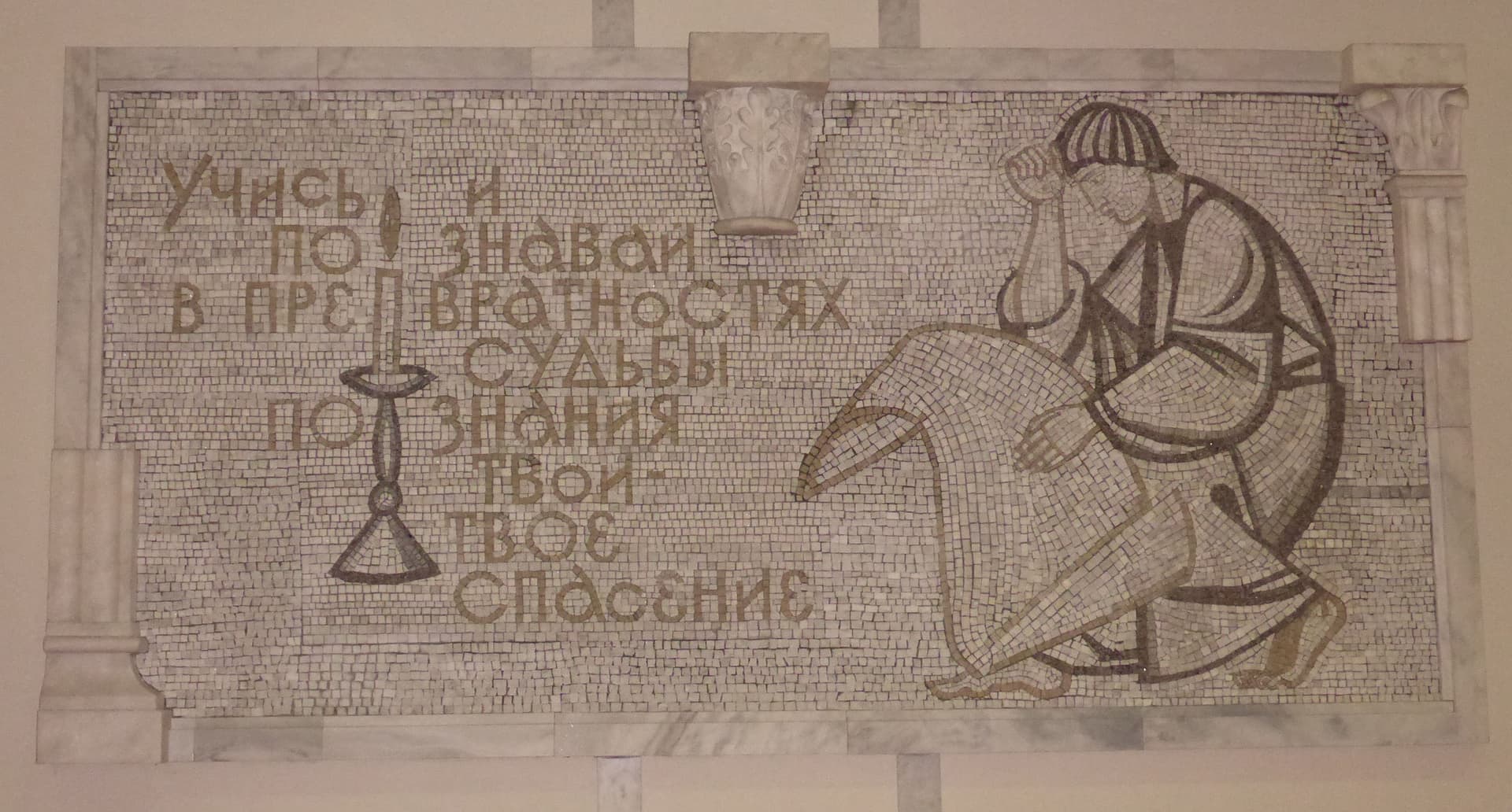 Un componente compositivo importante en el diseño interior del Nuevo Edificio son los paneles de mosaico dedicados a los libros, la cultura y los temas eternos: nacimiento y muerte, guerra y paz, verdad y error, perseverancia y humildad. La claridad de las composiciones de los mosaicos, su estricto colorido encajan perfectamente con la subrayada sencillez de la decoración interior del edificio.
