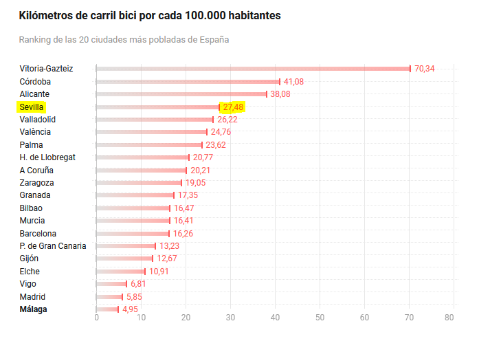 Cuarta ciudad con más km/100k habitantes de carriles bici. Ese dato no incluye las últimas prolongaciones, ya se han sobrepasado los 30km/100k hab.