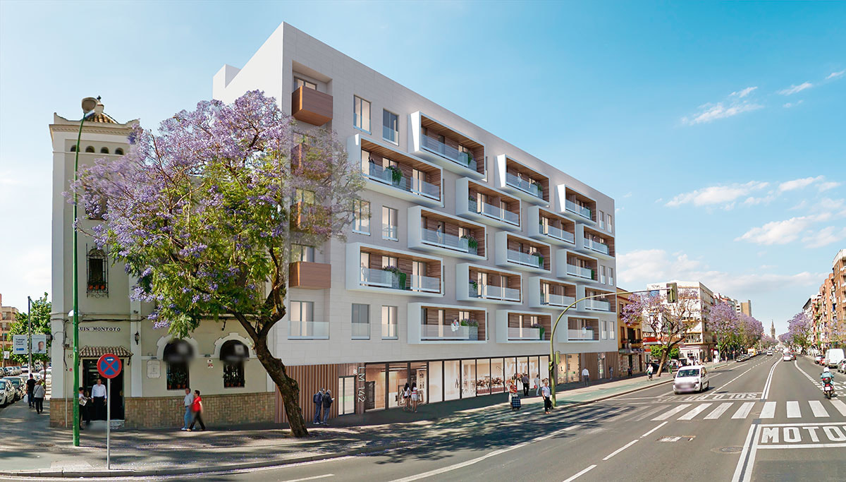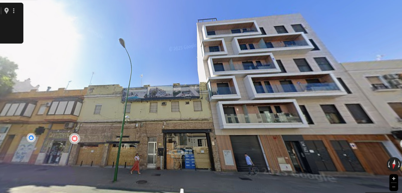 Nueva promoción de 26 viviendas en el entorno del estadio Benito Villamarín. Podrían haber aumentado la altura (hay bloques de 12/13 plantas en esa zona) pero al menos no es un zebra…