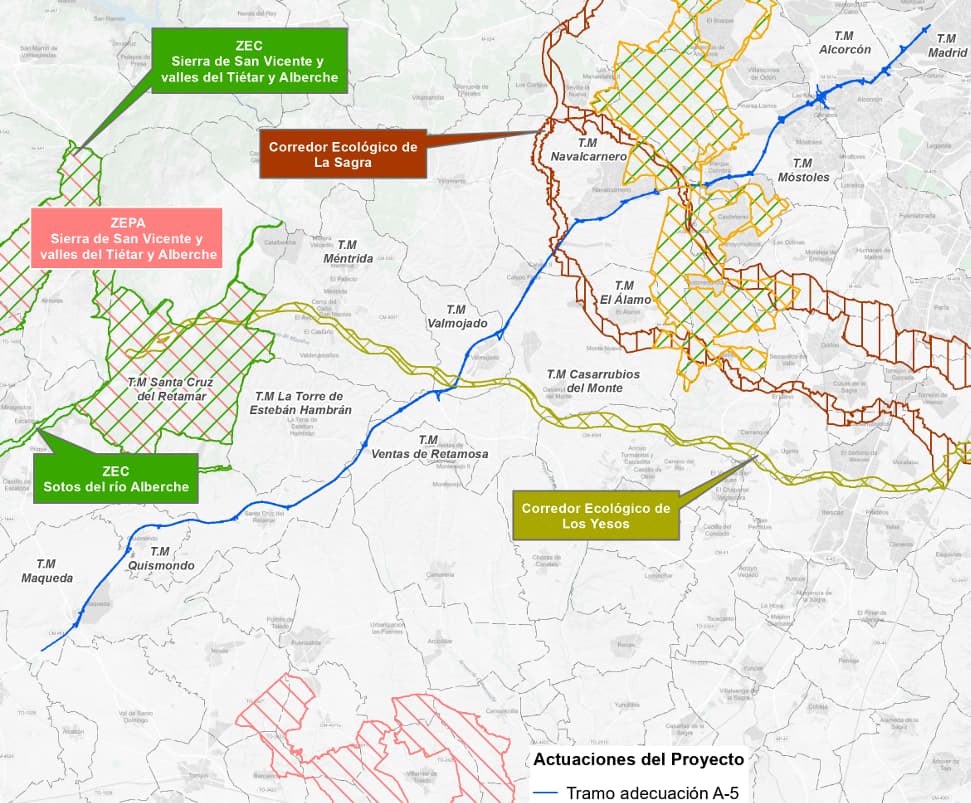 La autovía del Suroeste A-5 atraviesa tres Comunidades Autónomas: Madrid, Castilla-La Mancha (provincia de Toledo) y Extremadura (provincias de Cáceres y Badajoz). El tramo objeto de estudio comienza en el p.k. 10+000, antes del enlace con la M-40 (Madrid) y finaliza en el p.k. 74+000, en el enlace de conexión con la Autovía A-40 (Toledo).