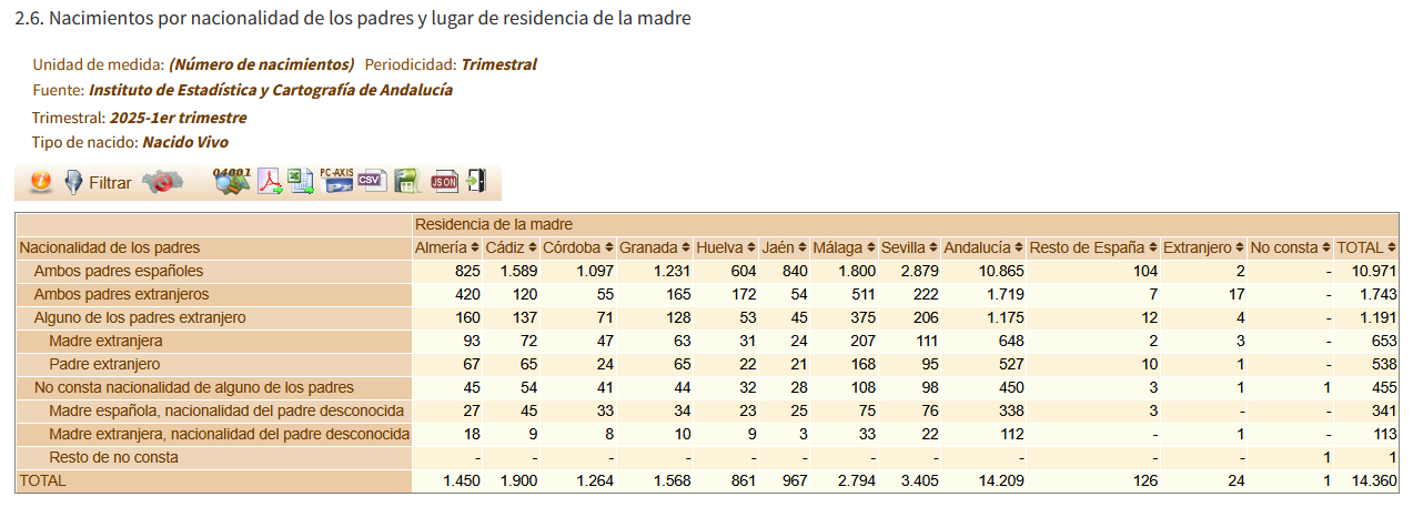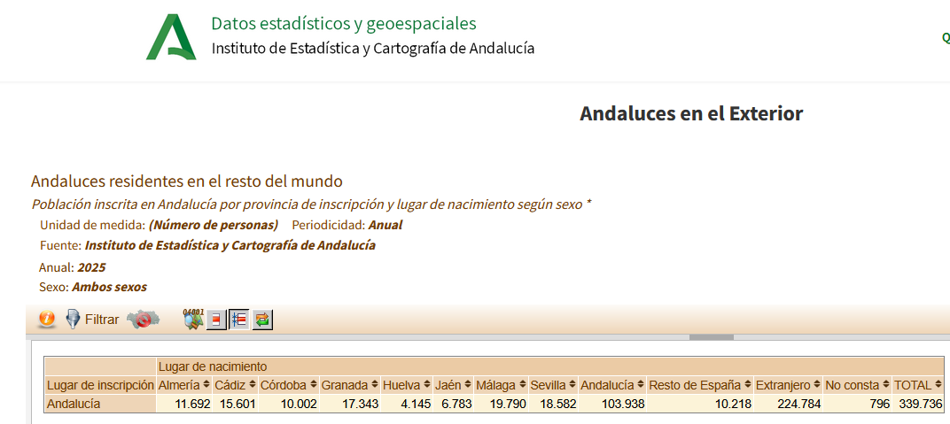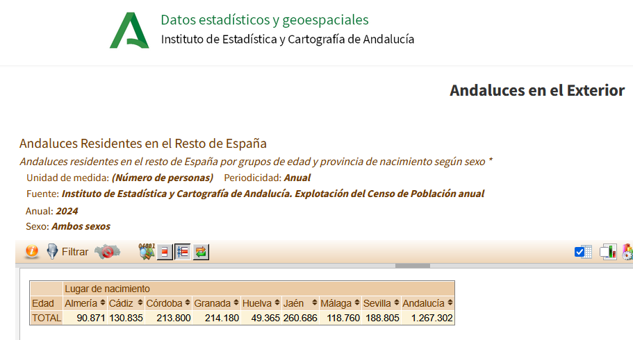 En el IECA se pueden consultar las estadísticas con respecto a los andaluces en el resto de España (1.267.302, una auténtica diáspora en el país) o en el extranjero (103.938 a 1 de enero de 2025, casi 340mil si se cuenta a nacidos en el resto de España o en el extranjero que tienen la nacionalidad).