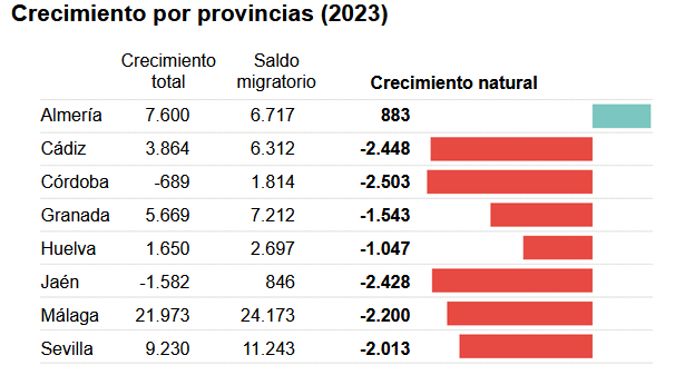 Andalucía, con más de 8,6 millones de habitantes, es la comunidad más poblada de España y sigue creciendo, gracias al saldo migratorio ya que el descenso de la natalidad es generalizado. No obstante, este crecimiento se ha ralentizado y los expertos prevén que la población se mantenga hasta 2040 pero, si no se actúa, para 2070 perdería 800.000 habitantes.