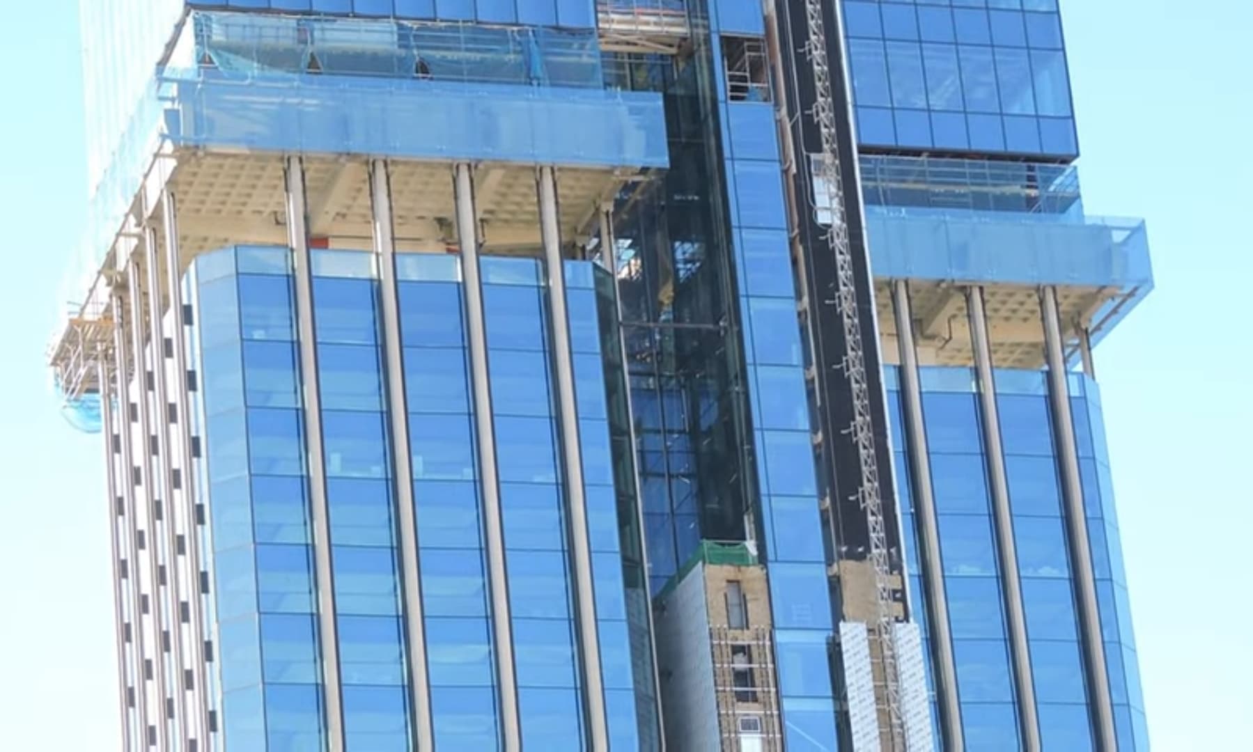 Esa es quizás una de las cosas que menos entiendo: por qué los vidrios que recubren el núcleo de escaleras central no mantienen, en las plantas altas, la concavidad de los vidrios de esas plantas, sino que continúan planos como los de las plantas inferiores. Ya tienes diferencia estética en las dos direcciones.
