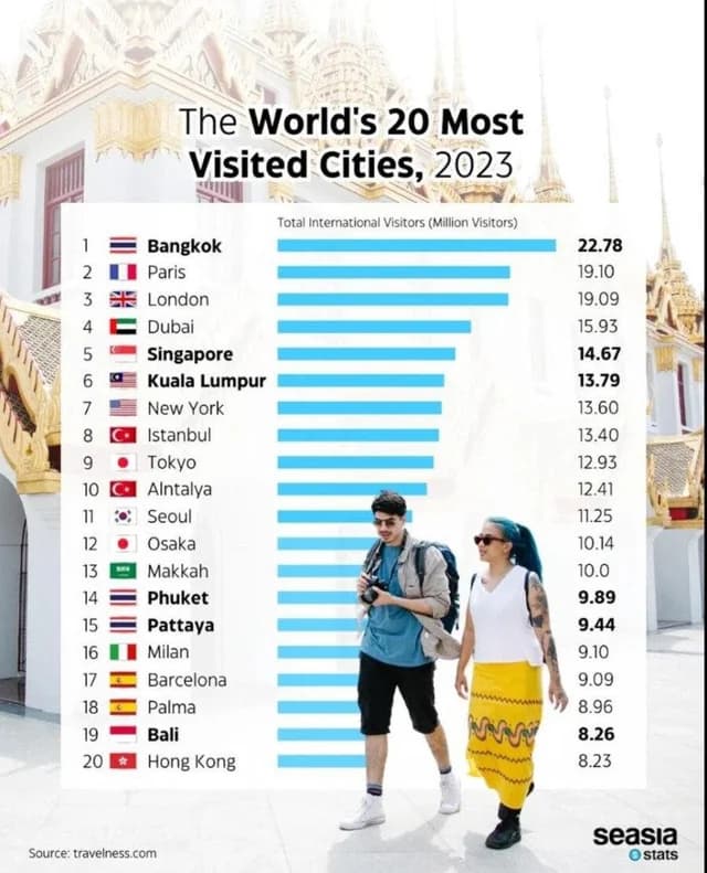 Después de Bangkok, como las ciudades más visitadas del mundo, se encuentran Estambul, Londres, Hong Kong, La Meca, Antalya, Dubai, Macao, París y Kuala Lumpur; todas ellas ciudades que siguen atrayendo a millones de visitantes debido a su rica oferta cultural, entornos favorables para los negocios y una sólida infraestructura turística.