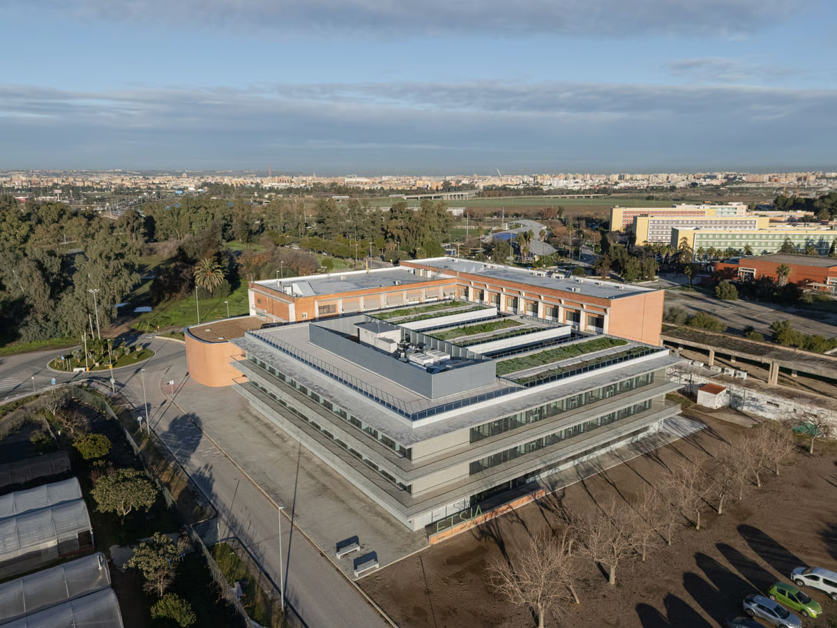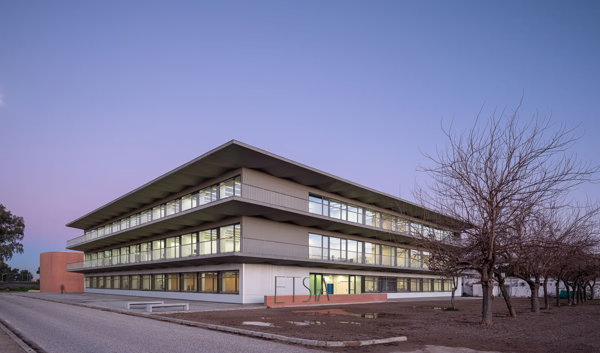 Esta obra -resultado de un concurso público con jurado- aborda la ampliación de la ETSIA de la Universidad de Sevilla como primera fase de un proyecto global que también comprende la rehabilitación de la sede actual ubicada al sur del campus de la antigua Universidad Laboral. Junto a la nueva edificación, incluye la construcción del salón de actos que remata uno de los extremos del inmueble original y hubo de ser demolido ante las graves patologías que presentaba.