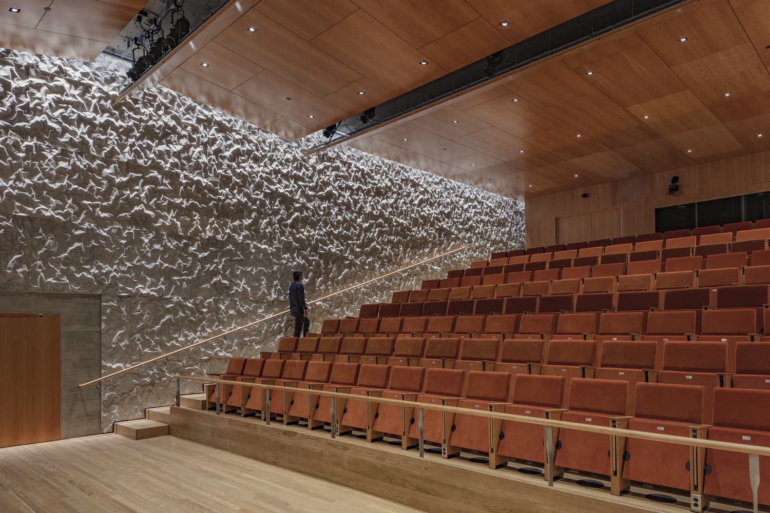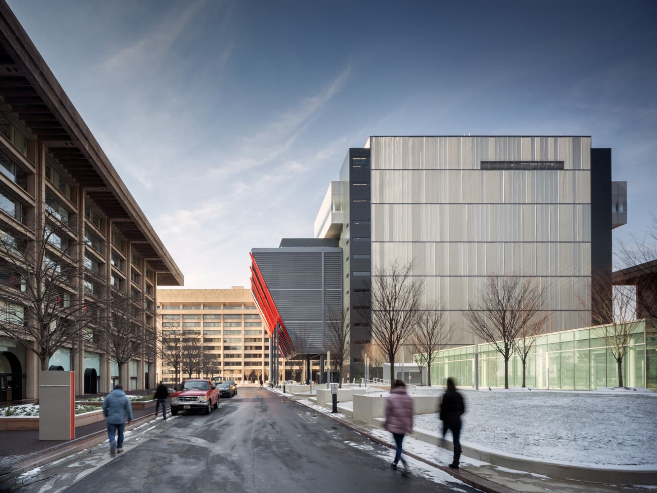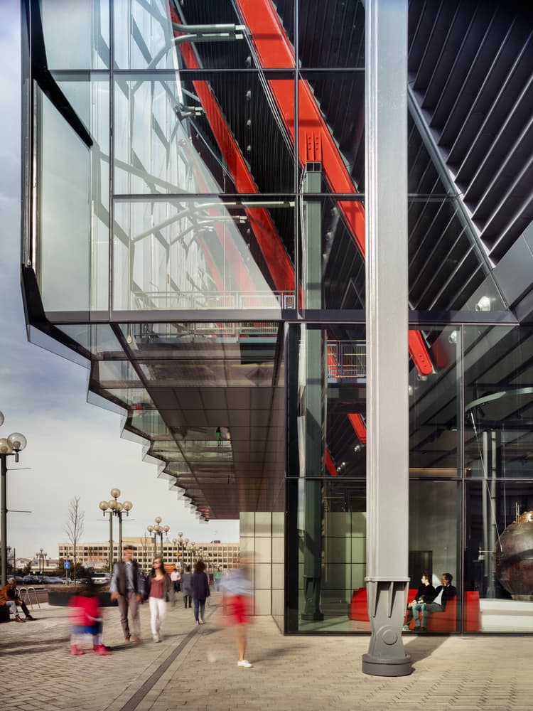 El edificio alcanza el límite de altura de la ciudad de 130 pies desde el nivel del suelo en sólo siete pisos. Sus características más destacadas son las fachadas en ángulo de los pisos de exhibición en los lados sur y oeste del sitio, encerradas en una caja negra. Sostenida sobre columnas sobre una estructura existente alineada, la caja negra comprende la mayor parte del edificio, incluidos sus espacios de exposición. Se trata de una estructura flotante que crea espacios públicos y privados para una combinación de diferentes usos.