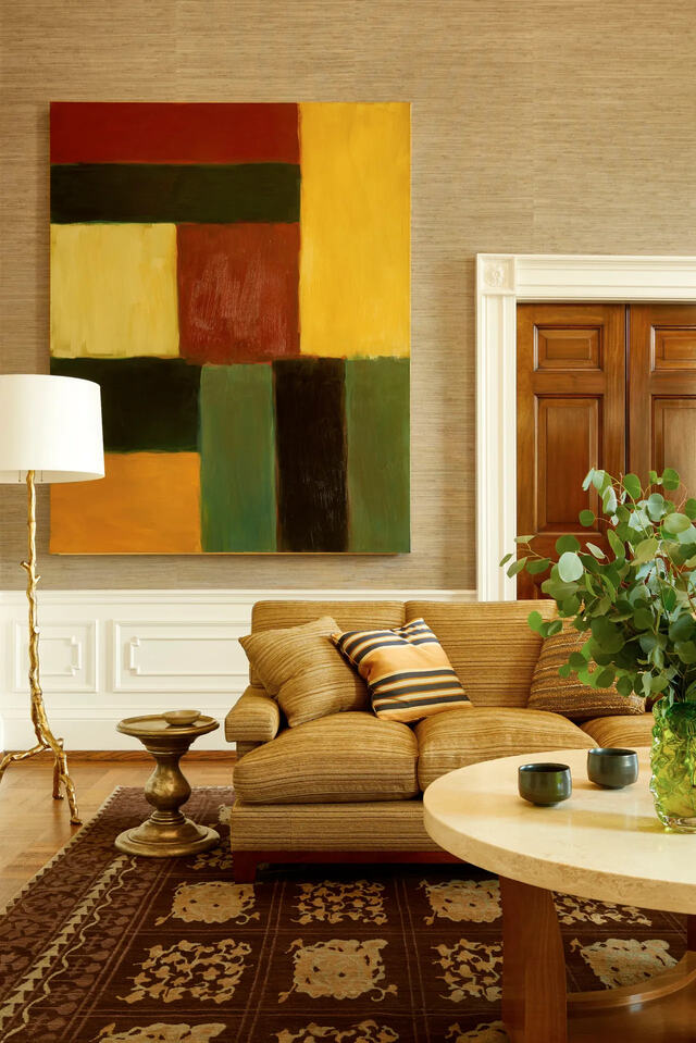 En la Sala de Estar Familiar, el cuadro ONEONEZERONINE RED de Sean Scully , cedido por la Galería Nacional de Arte, se exhibe contra una pared revestida con un papel de tela de Crezana. El sofá es de Roman Thomas, la mesa auxiliar con pedestal y la mesa con tablero de travertino son de Jasper Furniture, y la alfombra es de Mansour.