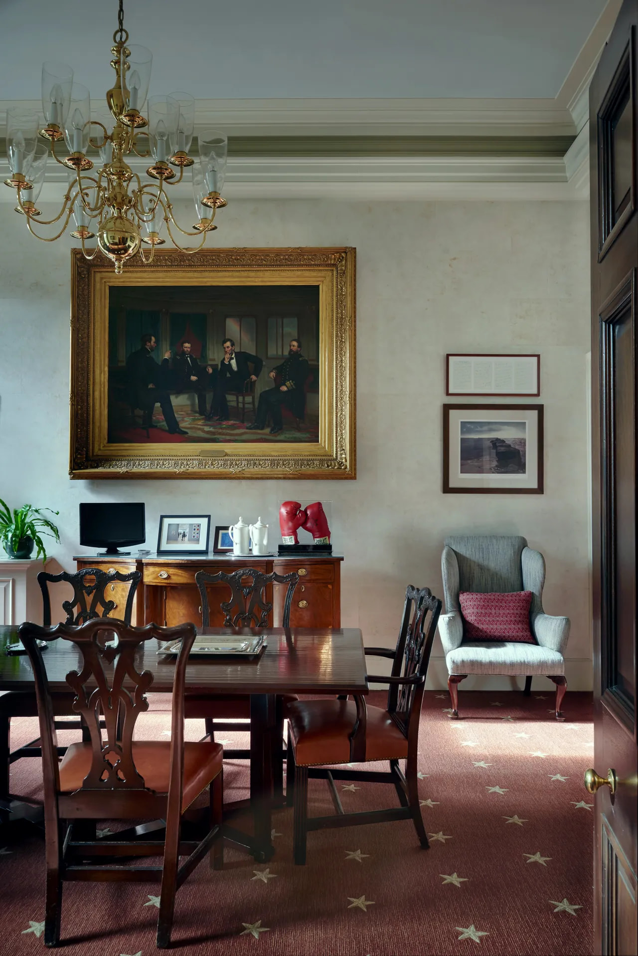 En el comedor privado del presidente Obama, The Peacemakers , de George PA Healy , una pintura de 1868 que representa las negociaciones de paz de la Guerra Civil, se exhibe en la pared del fondo, sobre un par de guantes de boxeo de Muhammad Ali autografiados “para Barack”; a la derecha hay notas enmarcadas de un discurso de JFK y un paisaje marino pintado por el senador Edward M. Kennedy. “MICHAEL MUNDY michaelmundy.com”